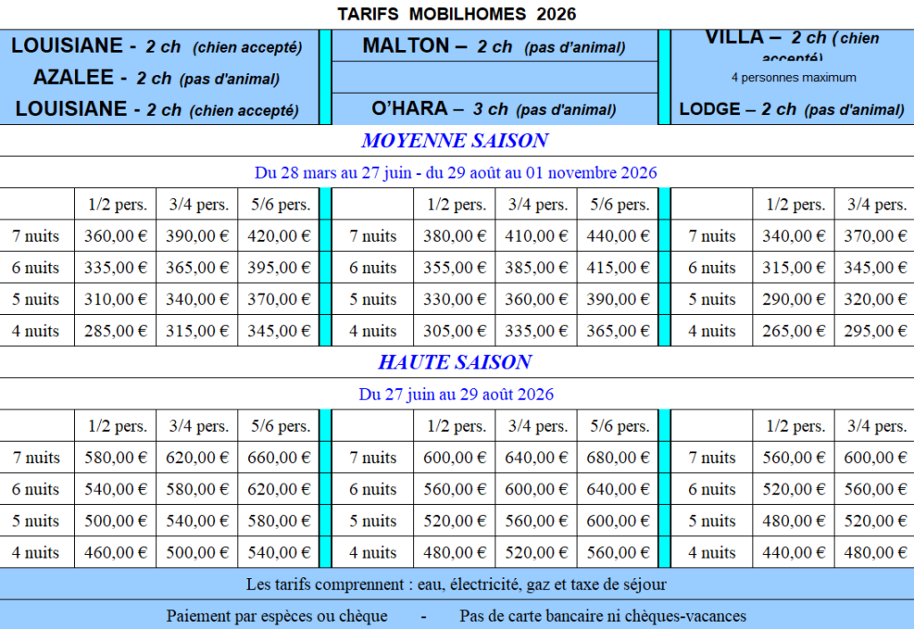 Le Vieux Châtel vous propose une gamme de mobil homes de 1 à 6 personnes, avec un minimum de quatre nuitées, aux tarifs suivants :